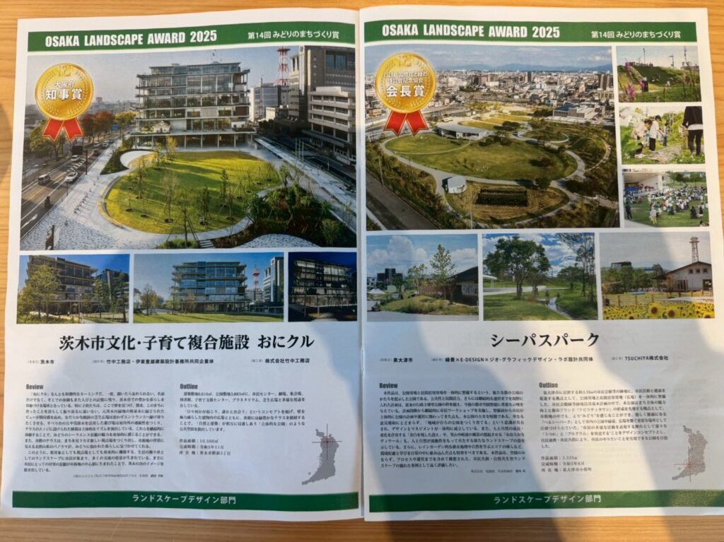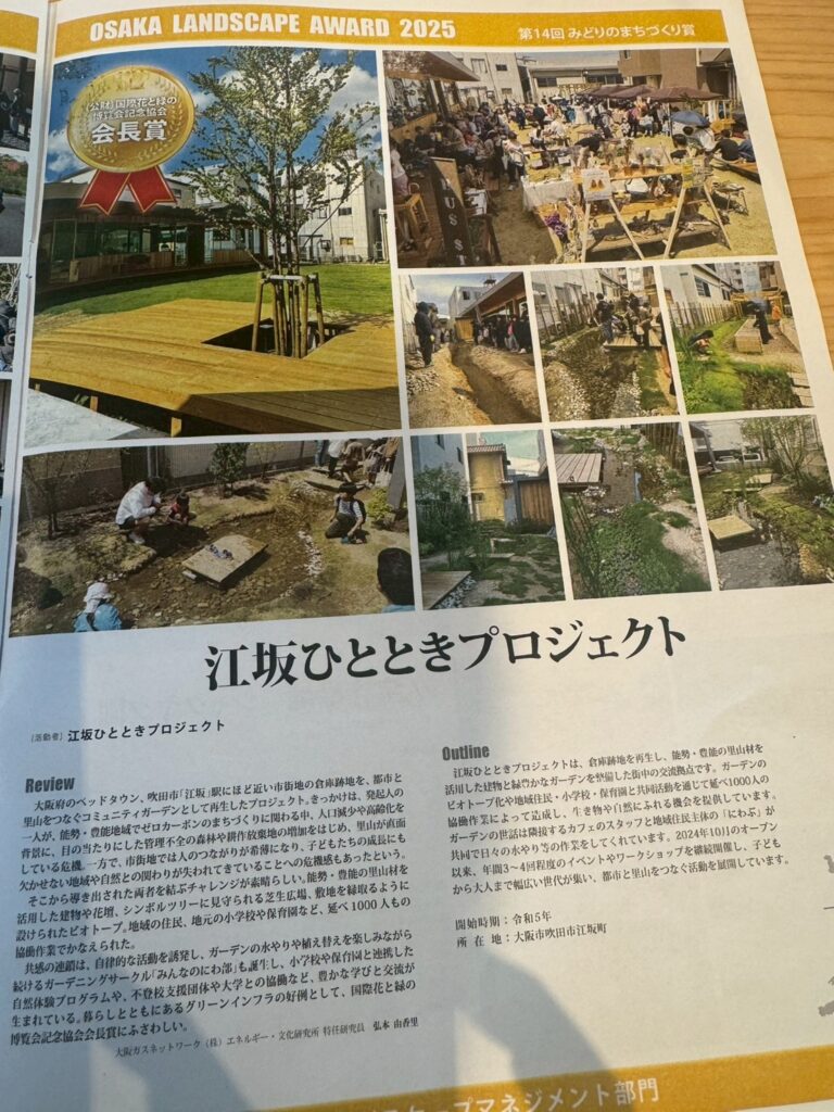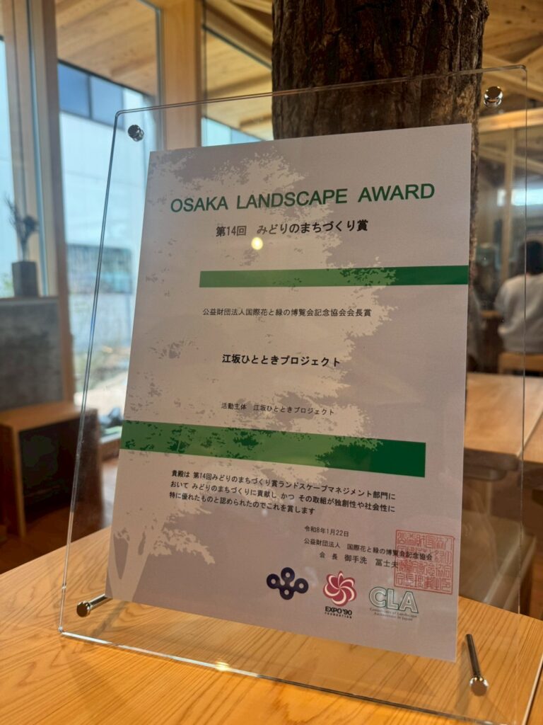 他の受賞者は茨木市の子育て複合施設「おにクル」さんや泉大津市の「シーパスパーク」さん、千里万博の日本庭園さんなど、早々たる面々の中、江坂ひとときも選考していただき、とても光栄です!