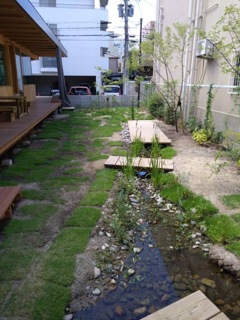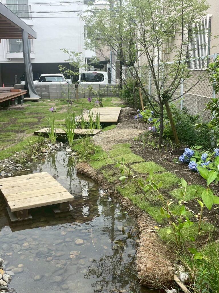 雑草除去作業、小川の青藻撤去、芝生カット、花植えを行いました。
